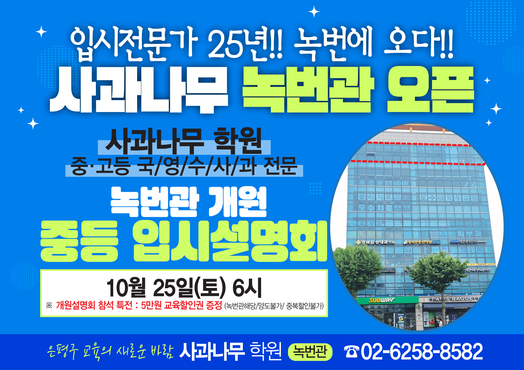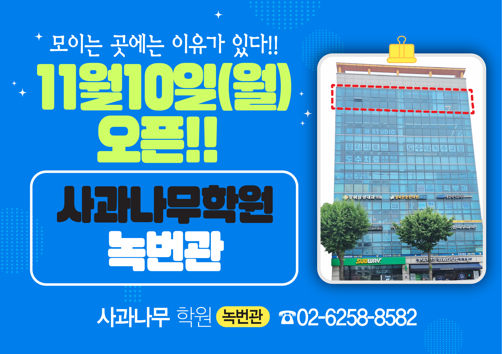 입시특구 목동에서 25년째 성장을 거듭하고 있는 목동 사과나무학원이 녹번역 인근 새로운 시작을 준비하고 있습니다.